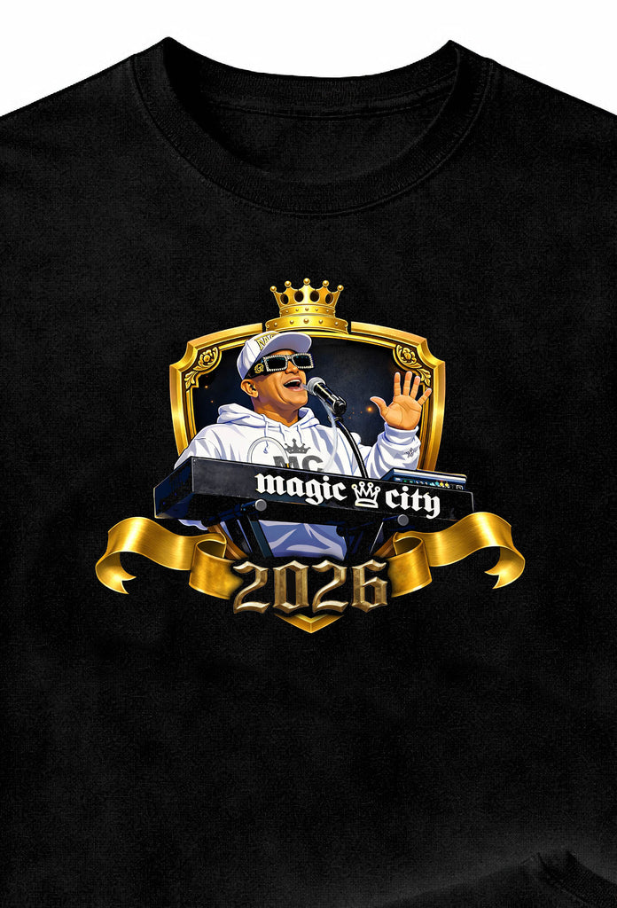 Just in time for my 2026 Concert Season we bring you our  latest T-shirt Design. Black t-shirt with the Golden Crown Crest on the front featuring a photo of me doing what i love to do. Performing on stage! The back side features the mc magic logo in rhinestones. each T-shirt carefully hand crafter to assure best results. Remember to hand wash & hang dry for long life of my 2026 collection. 🖤 MC Magic